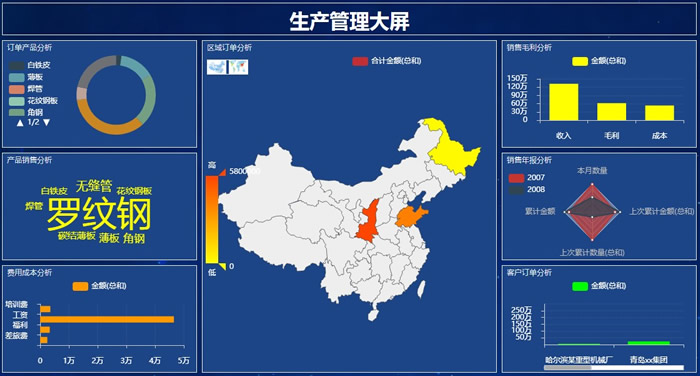 可通过系统中的图表(地图、饼图、柱状图、雷达图等)标示企业的关键指标,实现对指标的逐层细化,深化分析,直观的监测企业运营情况,并可以对异常关键指标预警和挖掘分析。