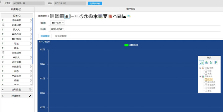 6.“客户订单分析”图表为柱状图类别,图表属性“大小”中每页记录数据设置为“2”。