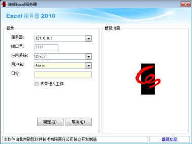 点击菜单【Excel服务器2010】-【Excel服务器客户端】,出现登录窗口,登录之后,将自动打开Excel,其中增加了一个新的菜单项(功能区)“Excel服务器”。也就是说,客户端的主要功能是以附加到Excel中的菜单项的形式体现,用户完全在自己所熟悉的Excel环境中工作。看起来就好像Excel的功能被扩充了一样。这些功能包括: