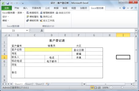 - 点击“确定”按钮,回到 Excel 界面。如果上步选择的是“在空白工作簿上自己画”,则打开一个新的空白工作簿;如果选择的是“用以下 Excel 文件的格式作为表样”,则把指定的 Excel 文件打开。不论哪种情况,当前工作簿的窗口标题都是“设计:客户登记表”,表明此时处在“客户登记表”模板的设计状态下。