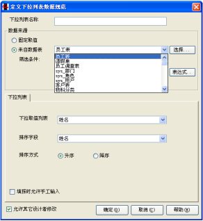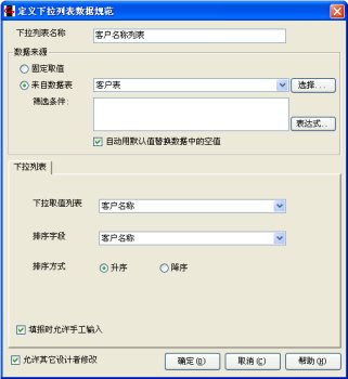 注意在这里,我们对数据源选择的是“来自数据表”,意思就是,下拉列表中的可选项不是事先写定的,而是根据“客户登记表”中的内容动态决定。