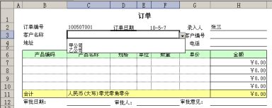 现在用张三的帐户登录,来填报一份订单,我们看到,“客户名称”处出现了下拉列表,其中的内容是我们已经输入的两张客户登记表中的客户名称。