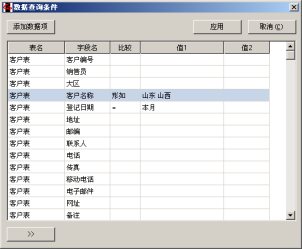 在“数据查询条件”窗口中输入的条件之间是“并且”的关系,即要求它们同时成立。例如,上图所示的条件意为:“客户名称”中包含有“山东”字样,并且“登记日期”在本月之内。