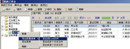 在我的工作台左侧选中要导出数据的模板,点击右键,选择弹出窗口【导出数据清单】 【导出成Excel文件】,在弹出窗口中选择目录,输入文件名,则把右侧显示的客户信息导出到指定的Excel文件中。