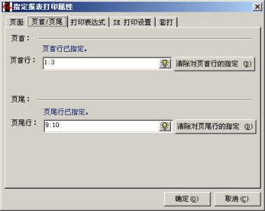 - 切换到“页首 / 页尾”选项卡,指定页首行和页尾行。可以手工输入,也可以点击带灯图案的按钮,直接从工作表上选择。