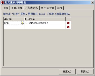 - 切换到“打印表达式”选项卡,可以设置页号、页数、打印时间等打印变量出现的位置。在本例中,我们设置在 F2 单元格放置页码和页数。