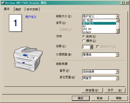 - 点击“纸张大小”旁边的下拉箭头,如果下拉列表中有一个空白行(空白行表示自定义纸张),要选中这个空白行,直接跳到第;否则,点击旁边的【选项 … 】按钮,弹出打印机属性窗口,纸张大小选择“用户定义 … ”。按系统提示操作,定义一种自定义的纸 型(大小不限,目的只是使得本计算机上有一种自定义纸型就可以)。