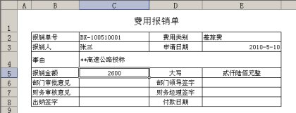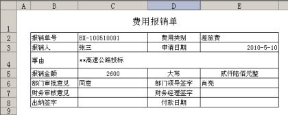 点击工具栏按钮【办理】,打开这张待审批的报销单,报销单内容显示在屏幕上,但不能改,只有“部门审批意见”、“部门领导签字”两处能输入内容。因为我们在定义工作流时,已指定“部门审批”任务的有效区域只有这两个数据项。