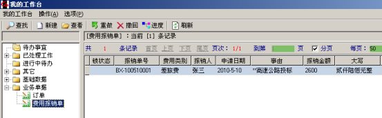 保存报销单,打开“我的工作台”,会看到这张报销单的信息。请注意,选中这张报销单后,在工具栏上有“新建”和“查看”,而没有“修改”和“删除”。