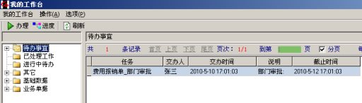 按照工作流的定义,刚才张三填制的报销单会直接提交到张三的上级--销售部经理“肖亮”那里审批。现在改用销售部经理的帐户xiaobu登录(回顾第3章的练习,在那里我们建立了帐户),在我的工作台中出现一条待办事宜,如下图: