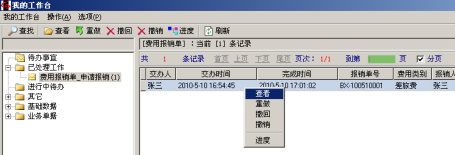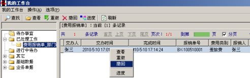 - 在我的工作台中展开“费用报销单”模板,找到这张报销单,点击鼠标右键,选择弹出菜单“撤回”