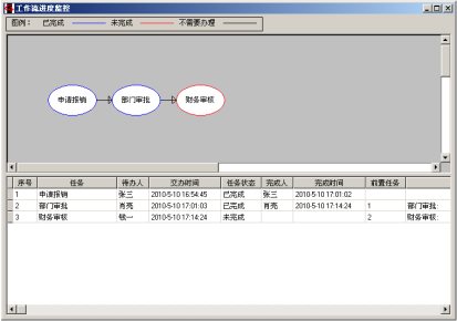工作流是多人协同完成一件事情的典型例子。流程中的个人,除了完成自己份内的工作外,还经常要关心其他人的工作进行情况。在我们的费用报销的例子中,如果报销人提出申请之后,希望了解审批进行到了哪一步,可以这样来做: