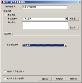 定义一个数据规范“订单号下拉列表”,并设置其为“出库单_主表”中“订单号”字段的填写规范。