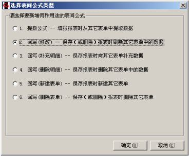 - 点击【新增】按钮,打开“选择表间公式类型”窗口,选择第二项“回写(修改)”,点击【确定】。
