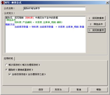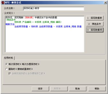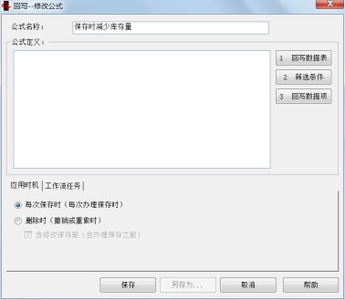 - 弹出“回写 - 修改公式”对话框,公式名称输入“保存时减少库存量”,应用时机为“每次保存时”,如图: