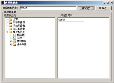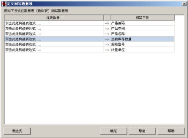- 点击【回写数据表】按钮,弹出“选择数据表”窗口,选择“物料表”,按【确定】回到“回写公式”窗口。