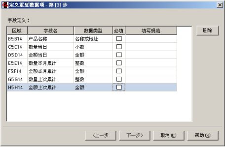 - 选中 B5:H14 ,定义重复数据项。注意第一步的上方标题行数要输入 2 。