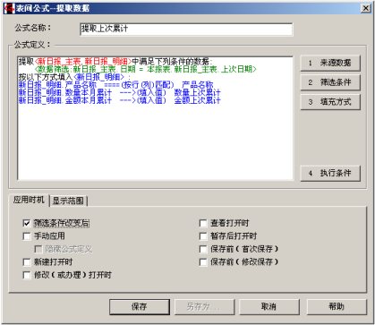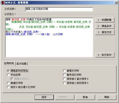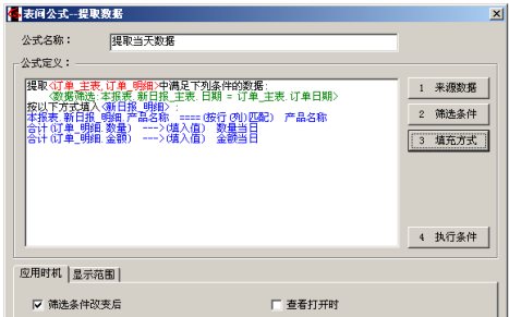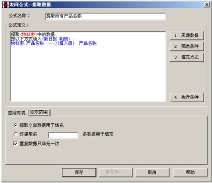 注意两处:1)应用方式我们选择了“新建打开时”,效果就是,当我们填报的时候,空白日报一打开,这条表间公式马上就执行。2)在显示方式处,我们选中了“重复数据只填充一次”。这是因为物料表中可能有这样的数据:名称相同,规格不同,所以如果全部提取出来会出现同样的品名重复显示好几行的情况,此选项用于保证重复的数据只显示一次。
