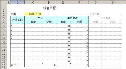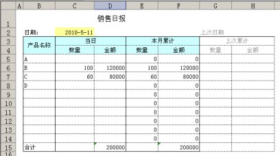 注意到日报上的产品名称已经事先写好了,所以填充统计数据的时候应该考虑到每种产品名称所在的位置:B产品在第6行,所以应该把100填到C6,120000填到D6;C产品在第7行,所以应该把60填到C7,80000填到D7。结果如下: