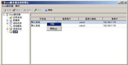 在系统管理台主界面的左侧,点中“连接节点”,右侧会看到当前登录到服务器的所有连接。选中其中的一个连接,右键弹出菜单,选择[中断],可断开选中的连接。系统管理员可以强制中断用户的连接,方法是:在系统管理台中选中要中断的连接,点击鼠标右键,选择弹出菜单【中断】。
