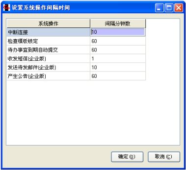 弹出“设置系统操作间隔时间”窗口,在这里可以设置间隔分钟数的系统操作有:中断连接,检查模板锁定,待办事宜到期自动提交,收发短信(企业版),发送待发邮件(企业版),产生公告(企业版)。