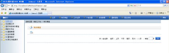 登录后出现的页面如下图所示。页面的最上方显示八个栏目,分别是“主页”、“待办事宜”、 “工作记录”、“个性设置”、 “系统管理”、“重新登录”、“退出系统”、 “帮助”。