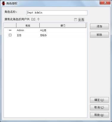 在管理控制台中,打开用户的属性窗口,在“角色”选项卡上选中“Dept Admin”;或者在管理控制台中选中角色“Dept Admin”,选择其右键菜单【角色授权】,添加要授权的用户。