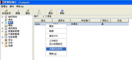 如果是设置了admin双重密码后第一次登陆管理台,那么附加码默认为“空”,点击确定进入管理台主界面。点击用户节点,找到admin,右键-设置附加密码,如下图所示: