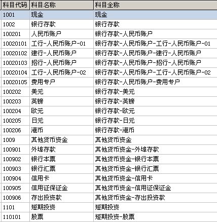 这里的“科目代码”隐含表达了一种分层信息,例如“1002”是“银行存款”,而“100201”是“1002”的下级科目,即“人民币账户”是“银行存款”的下级科目,同理,“10020101”又是“100201”的下级科目。
