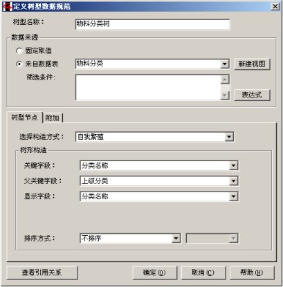 这种表达数据层次关系的方式,我们称之为“自我繁殖”,即层次关系通过两个字段表达,一个字段称为关键字段,此例中为“物料分类”,它将确定树型中的一个节点,另一个字段称为“上级关键字”,该字段的内容应该恰巧等于树型中另外一个节点的关键字段内容。