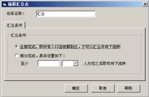 与之前接触过的工作流不同之处在于,该工作流程里多了一个“汇合点”(即流程图中的圆圈),汇合点的画法与“普通任务”一样,点击工作流窗口工具栏里的“汇合点”按钮,在画图区域单击,弹出“流程汇合点”对话框,输入任务名称并设置汇合条件,这里我们设置的汇合条件是:全部完成。