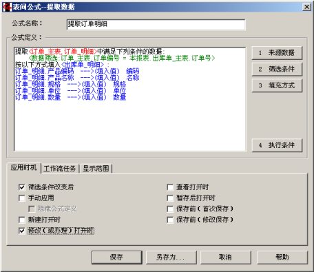 - 修改表间公式“提取订单明细”,在其应用方式中增加一种,“修改(或办理)打开时”。