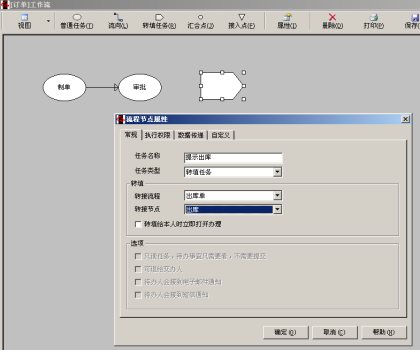 - 弹出“工作流”窗口,点击窗口工具栏上的【转填任务】按钮,鼠标移动到画板上“审批任务”右侧单击,出现五边形框,并弹出“流程任务定义”窗口。在“常规”标签上输入任务名称“提示出库”,在“转接流程”下拉列表中选择“出库单”,在“转接节点”下拉列表中选择“出库”。