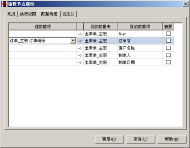 - 切换到“数据传递”标签,在“源数据项”栏的第 2 行下拉选择“订单 _ 主表 . 订单编号”,如图,意即订单审批通过后,即自动提示出库,并把本订单上的“订单编号”自动传递到出库单上。