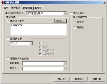 - 切换到“执行权限”选项卡,执行人选择“以下范围内用户→属于以下角色”,指定“储运部”、“仓库保管员”,多人协调方式选择“抢先式”,即每个储运部的仓库保管员都会接到一条待办事宜,无论谁先办理了,其它人的待办事宜即自动清除,不会出现重复发货的情况。