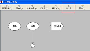 增加了一个终止点,审批任务到提示出库必须满足“审批意见”=“同意”,如果不同意,那么审批任务提交完成,并且整个流程终止。