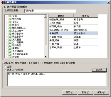 - 点击【回写数据表】,弹出“选择数据表”窗口,在左侧树型中选择要回写的模板名称“员工信息卡”,右侧数据表列表中双击选择表名“考勤记录”。
