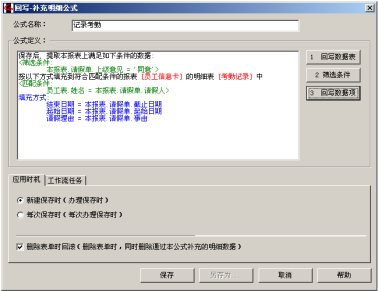 - 弹出“回写公式”窗口,输入公式名称为“记录考勤”,选择应用时机为“新建保存时”,切换到“工作流任务”标签下,任务名称选择“审批”。如图。