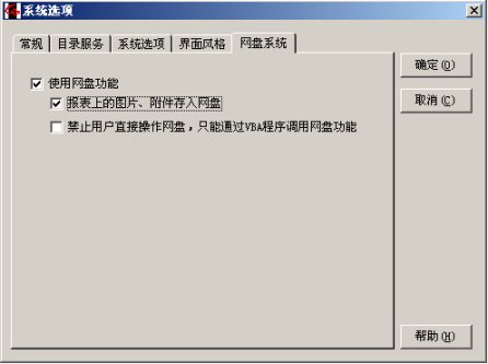 如图,在系统选项窗口上,勾选"使用网盘功能",勾选“报表上的图片、附件存入网盘”,然后点击【确定】。