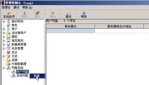 当在系统选项中设置了“使用网盘功能”之后,管理控制台的左侧树形会出现一个新的节点"网盘系统"。展开网盘系统节点,在“系统网盘”节点上点鼠标右键,选择新建菜单。