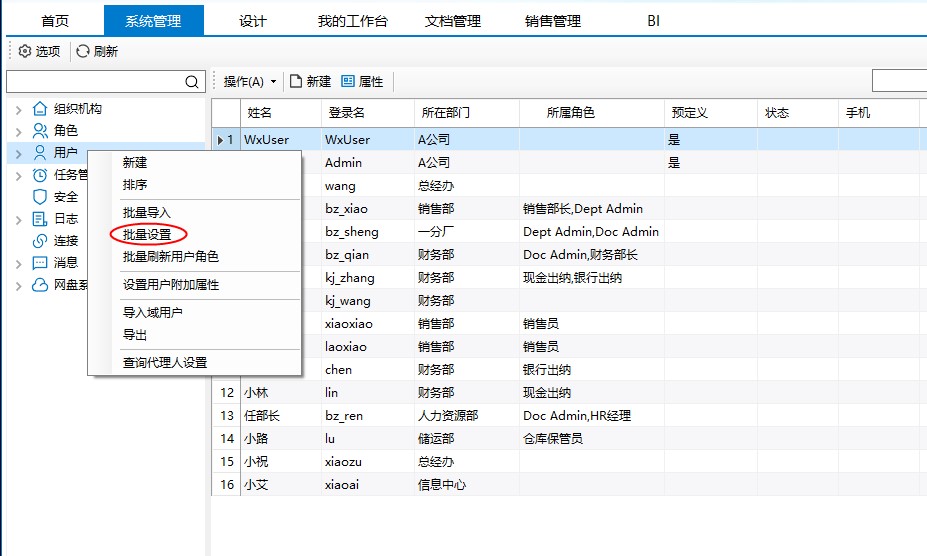 1.【系统管理】栏目下选中“用户”右键,点击【批量设置】菜单