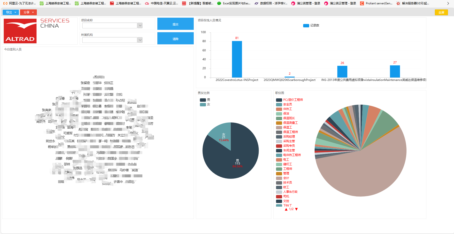 后期的考勤数据,就在勤哲服务器做考勤表,一键提取月底考勤。数据实时的。每天也可以看到,该项目在线打卡人员信息,用bi呈现。