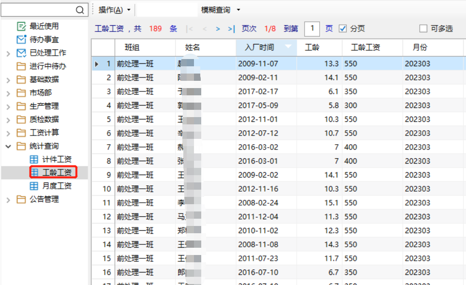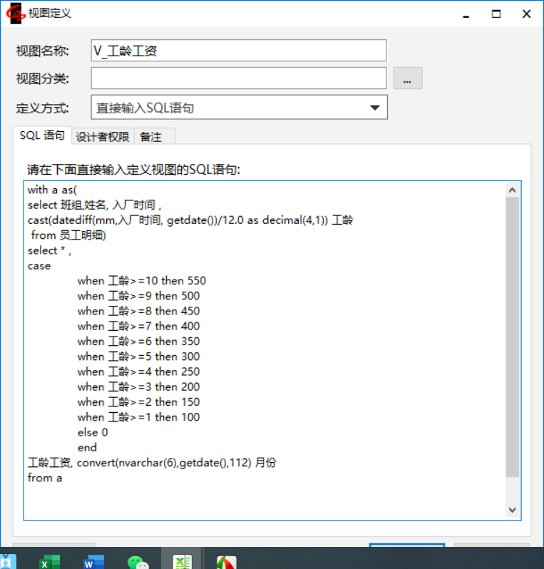 本案例单位为鼓励熟练老员工留厂服务,设有额外工龄工资,满一年员工每月可享受100元工龄工资,每增加一年加50元,到550封顶。我们可以通过视图关联第一步录入在员工信息中的入厂时间自动计算当前工龄工资。