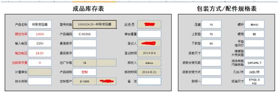 4.成品库存表记录了该成品的型号规格及包装方式,当产品出库时会根据产品的型号规格出库当然产品库存表里的相应的数量也会相应的发生变化。成品库存表有效的实现了生产部门和销售部门的数据整合共享。