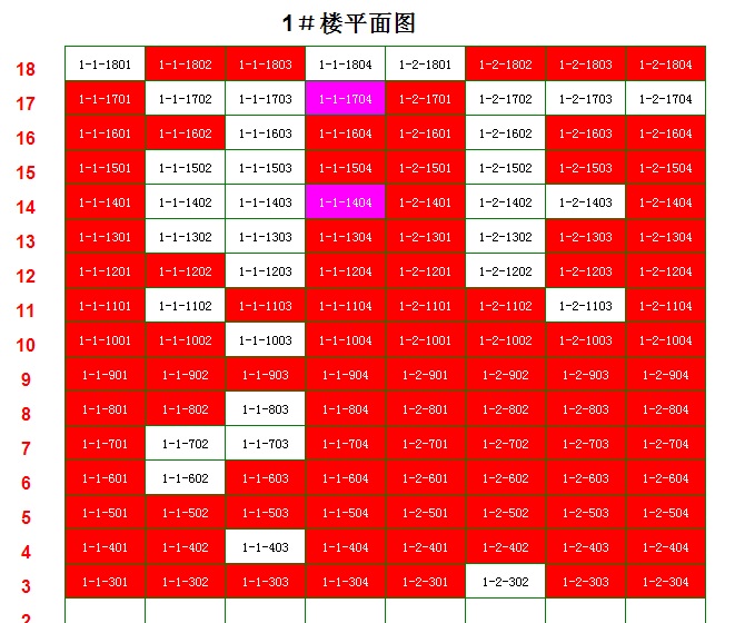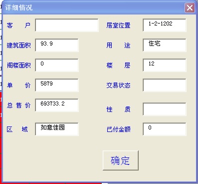 当客户选中房号时,销控统计表会自动修改房号信息,根据销控统计表可以清楚的看到已售房源跟剩余房源信息。当点击某个房号时,会显示该房的业主姓名、建筑面积、单价、总房价、交易状态、已付金额等信息。