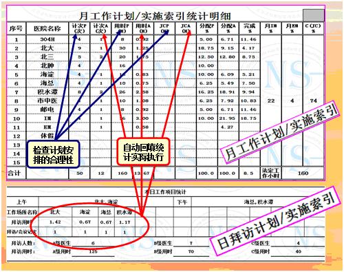 同时,随着拜访和其他推广活动的进行,日报表上的拜访/协访次数、用时及各种会议次数、用时等实际实施数据自动回填、自动累加到统计表中,可以随时对照计划察看实际执行的完成情况。