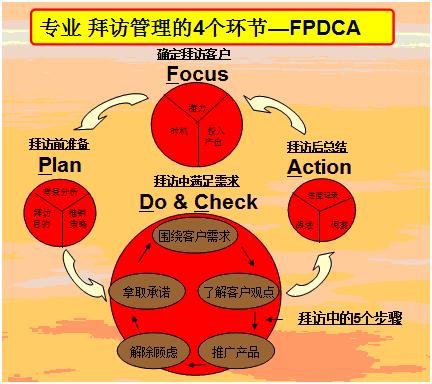 第一环节F-Focus确定拜访客户:就是要选定辖区目标医院和医院内的目标医生即,从潜力、投入产出和时机等方面综合考虑选择哪些医院和医生是我们要拜访的。这一环节我们已经在前面的辖区医生信息管理表和月工作计划/实施索引里完成了大部分工作,日拜访计划/实施索引里还需要再具体即,确定某个工作日将要拜访哪些医院及哪些目标医生。我们把F- Focus叫做“做正确的事情(Do the right things)”;第二环节P-Plan拜访前准备:针对每一个客户做好认真的访前准备将取得更好的效果,这是大家的共识。因为只有这样我们才能把握访谈方向,树立专业形象,提高拜访的成功率,增加销售代表的信心,拜访有目的?销售才有成绩!有些公司把这个环节概括为:HOPE(希望)--- Have Objective Prepared Every time就是说,有计划,有目的,才有希望!所有的医生都会欣赏医院代表为拜访所作的完善的准备。也只有当代表“准备好”拿承诺的时候,医生才会给他“真正的”承诺!日拜访计划/实施索引必须引导代表,通过考虑客户目前的状况?可采取的推广信息/策略?可能碰到困难及解决方法、需要准备哪些资料和礼品、需要特别注意的事宜等方面,系统地做出专业的拜访计划。这一环节实际上是怎么样帮助代表把要做的事情做对,所以,我们把P-Plan叫做“把事情做正确”(Do the things right);第三环节DC—Do & Check拜访中满足需求:确定了拜访对象,制定了专业拜访计划,下一环节当然就是执行和检查。也就是代表所学习的专业沟通技巧里拜访过程中的5个步骤即,围绕客户需求、了解客户观点、推广产品、解除顾虑、拿取承诺。我们一边这样做(Do),还要一边对照我们访前计划进行检查(Check)。看看计划的哪些语言、策略、信息是行之有效的,哪些经常会受到医生“挑战”。这样我们就能把“行之有效的”继续用到下一次拜访,把受到医生“挑战”的进行反思。看看我们是否是在聆听、解答或肢体语言方面有明显的不妥,或是亲和力不够、或是需要增加更有力的证据、或是改变语言措辞、策略等等,使之能在下一次拜访“行之有效”。所以,简单地说这一环节就是:执行计划并找到正确的方法(Carry out & find the way);第四环节Action改善处理:一天的拜访下来,经常需要整理和调整一下拜访思路,这样才好确定下一步做什么?怎么做?。主要包括:我做了什么?我怎么做的?对方的反馈是什么?下一次我应该做什么?需要跟进哪些已达成的决定?需要解决哪些遗留的问题?怎样继续下一步的方案?因此,这一环节主要是实施情况的总结提高即,改掉缺点,保持成功之处(& Keep)。最后,回到专业拜访管理的开始环节并为下一次销售拜访做准备。