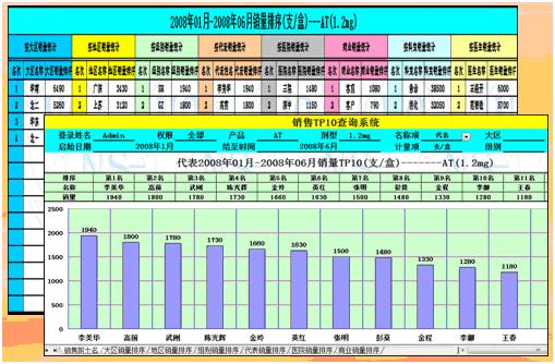 ? 分产品、剂型;分大区、地区、代表等选项进行销量排序。并可以直接显示出销量前十位的统计图;