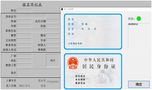 1、员工初次报名,填报报名登记表,员工身份信息刷一下身份证读卡器,自动录入系统,实现零错误,高效率。
