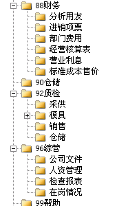 软件的功能是一个逐步设计的过程,目前已经实现了:采供管理,生产管理,销售管理,质检管理,财务管理,仓储管理,综合管理。各模块根据业务细分为更多子模块: